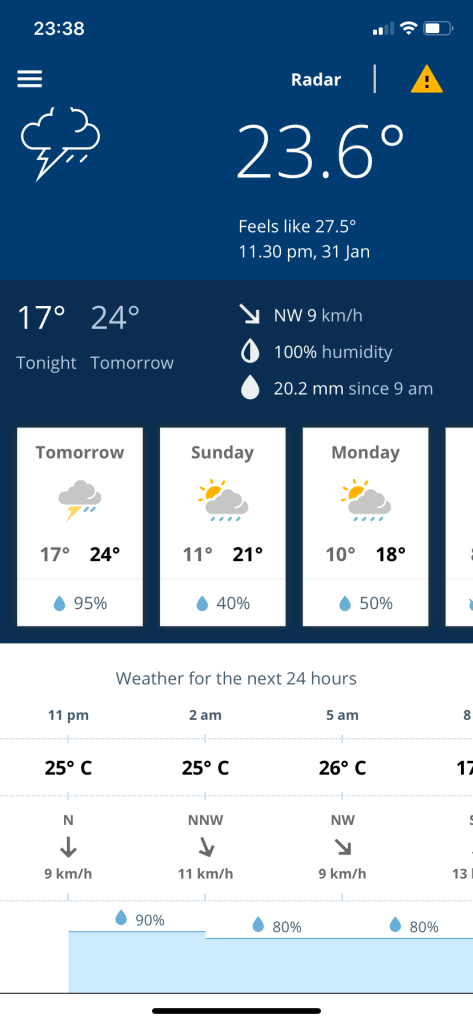 It’s currently 11.35pm and still warm out, even though a cool change came through a few hours ago and dropped the temperature by ten degrees in as many minutes. It’s also pouring rain – and I’m not going to complain about that!